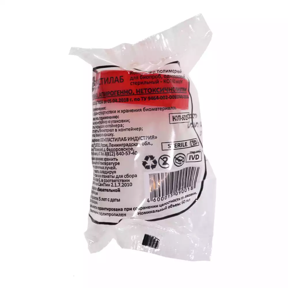 Контейнер 60мл, для взятия биоматериала, стерильный, индивидуальная упаковка, без лопаточкиПЛАСТИЛАБ ИНДУСТРИЯ (РОССИЯ), 500 шт