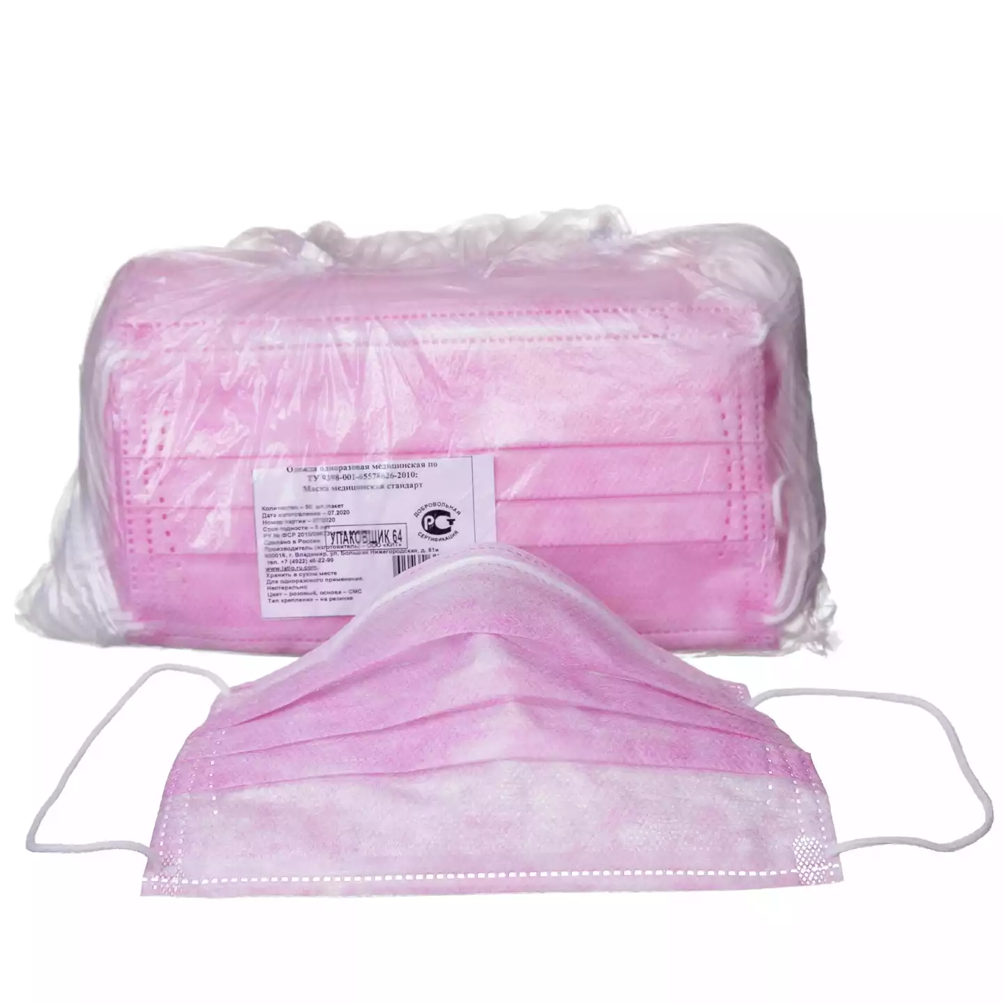 Маска Стандарт, 3-х слойная (спанбонд-СМС-спанбонд), с фиксатором, на резинке, нестерильная, розовая, п/э пакет