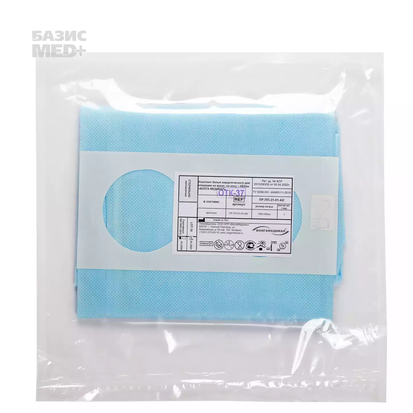 Простыня (наглазник), размер 100*100см, материал СМС 42г/м, с 2-мя отверстиями 7см, с липким краем, 2 внутр. кармана, СМС 42г/м2, стерильная, голубаяВолга Медикал НПП (РОССИЯ)