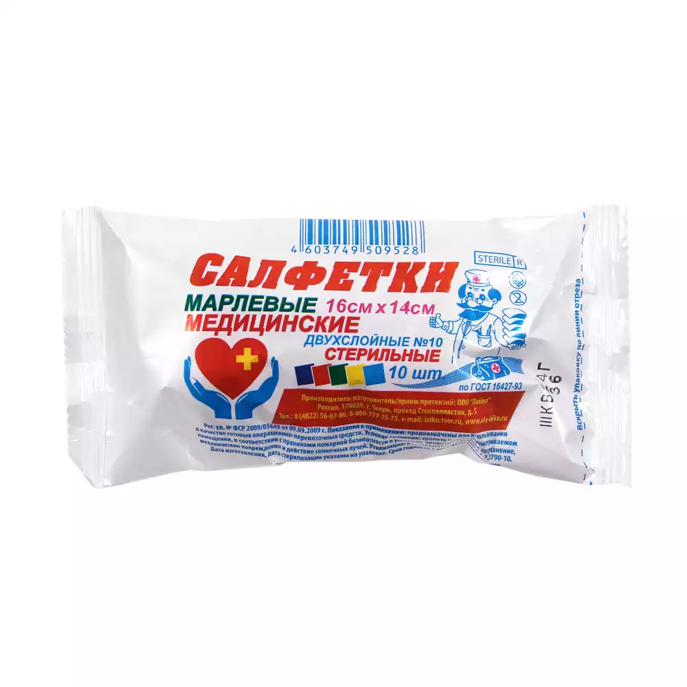 Салфетка марлевая №10, 2-х слойная, размер 16*14см Лейко, плотность 28г/м2, стерильнаяЛейко (РОССИЯ)