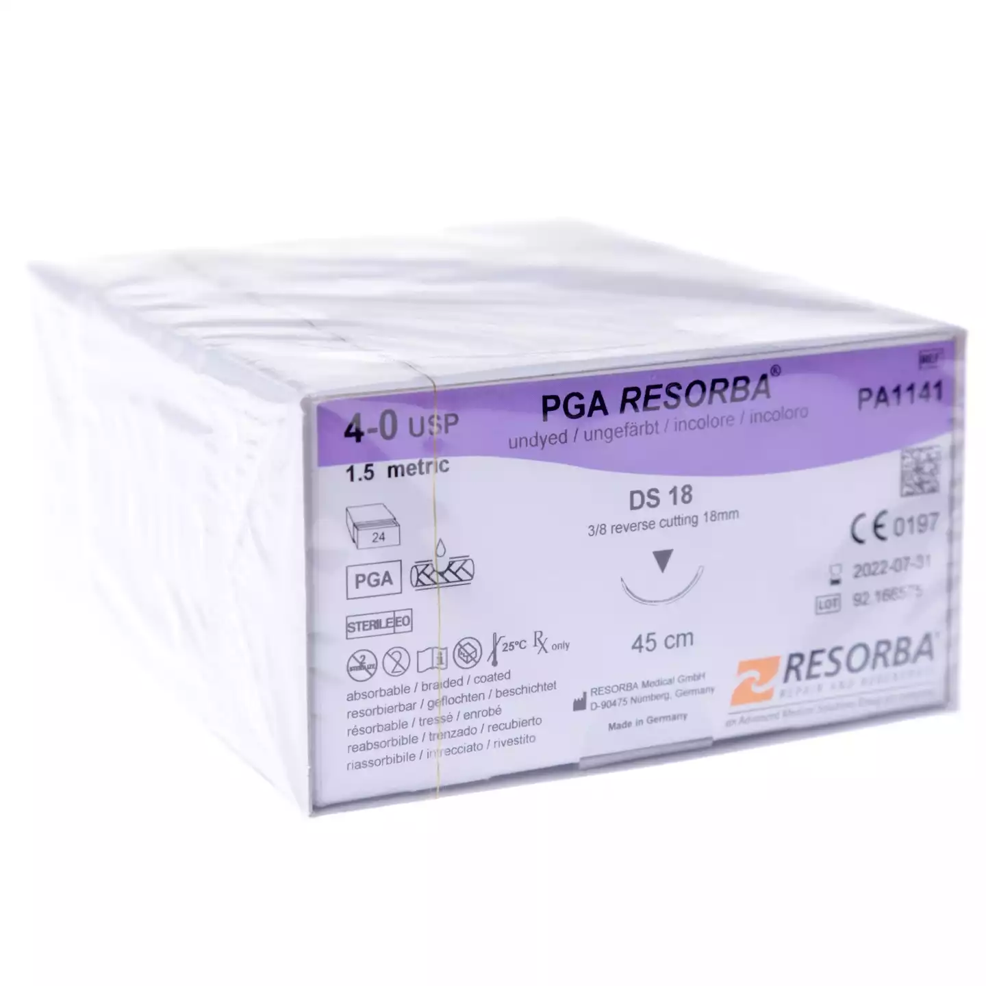 ПГА-РЕСОРБА (PGA) М 1.5 (4/0), длина 45см, игла DS 18 режущая 3/8 круга, неокрашенный, упаковка 24шт, РА 1141Resorba Medical GmbH (ГЕРМАНИЯ)
