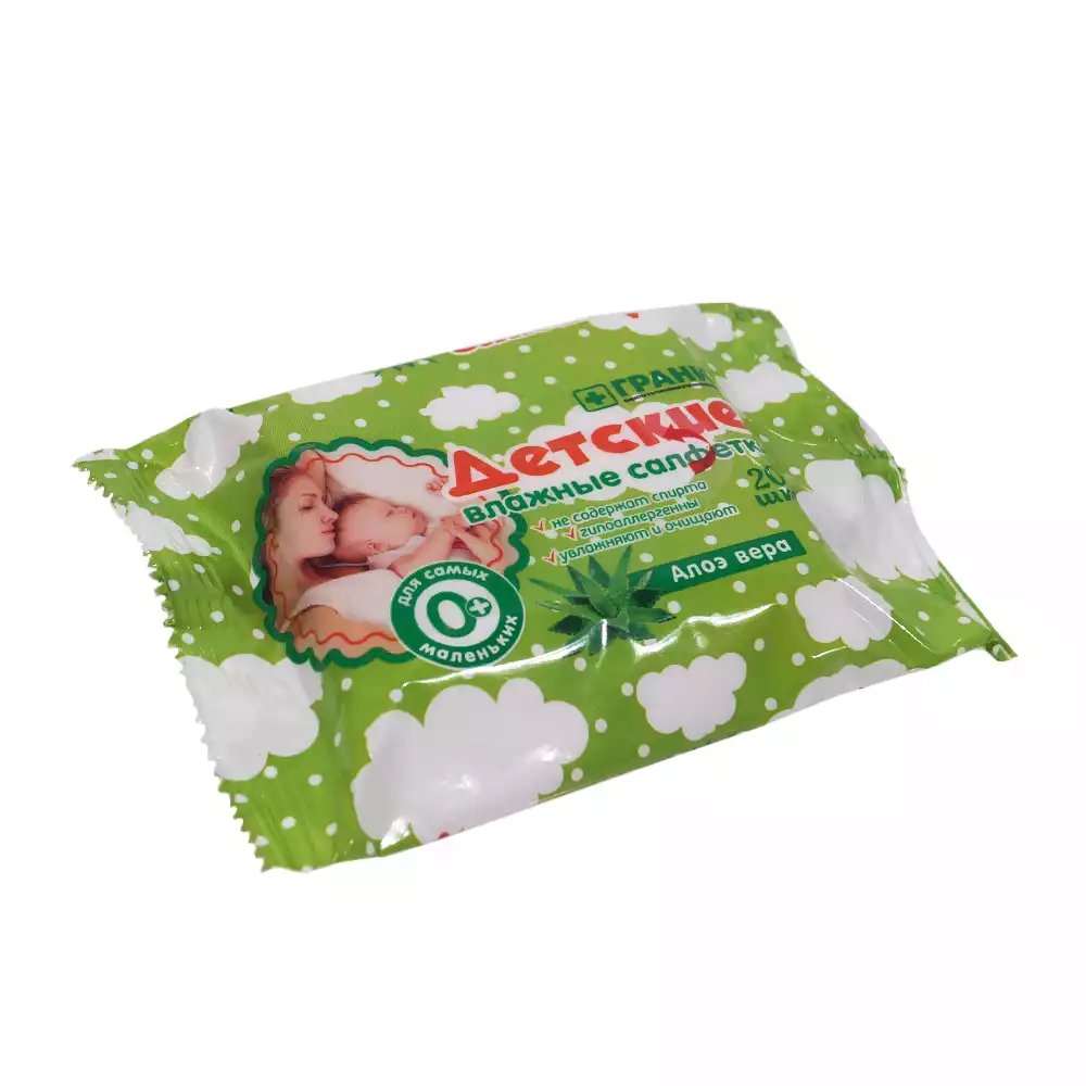 Салфетки влажные с Алоэ Вера, детские, гигиенические, не содержат спирта, размер 15*15см, упаковка 20штГрани (РОССИЯ)