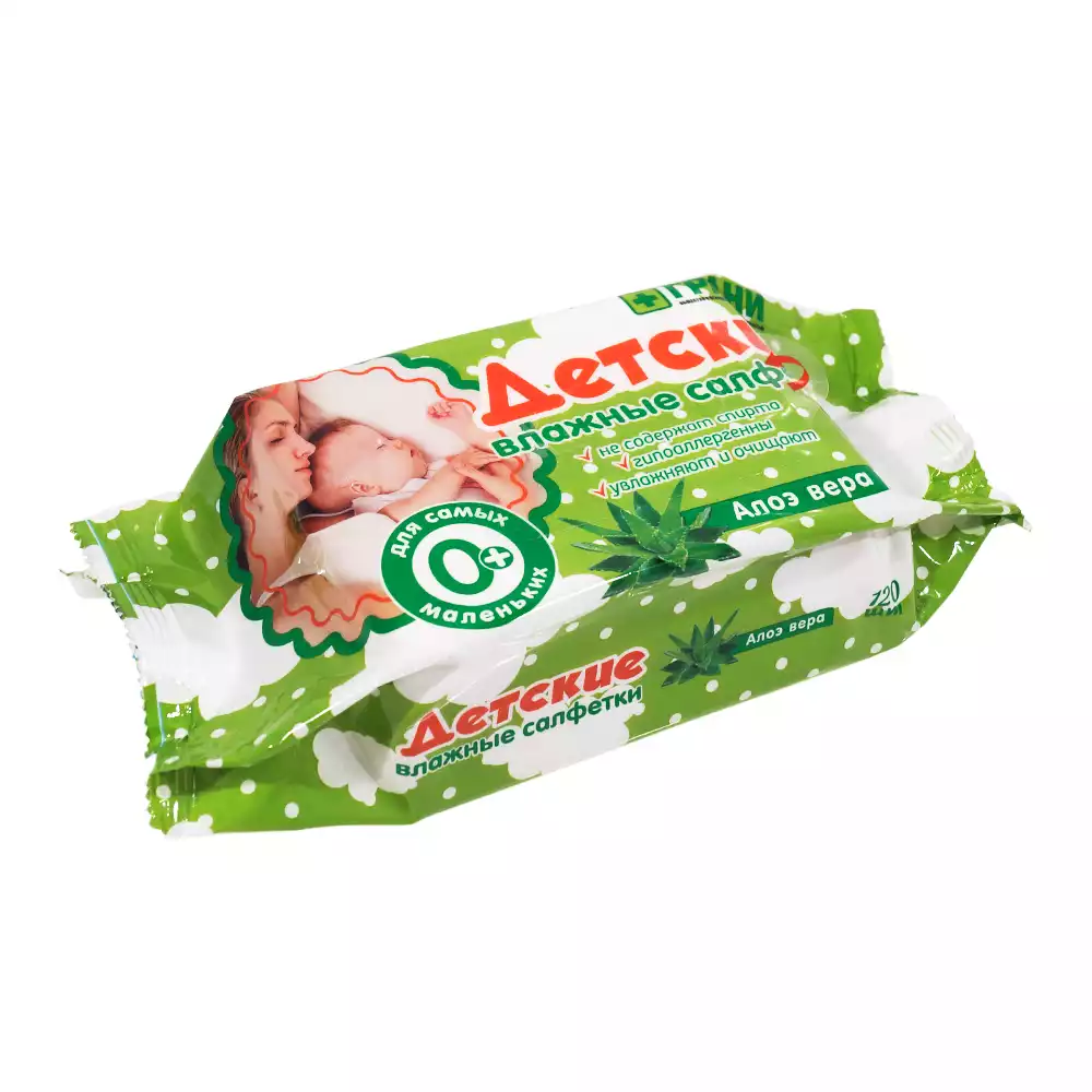 Салфетки влажные с Алоэ Вера, детские, гигиенические, не содержат спирта, размер 15*15см, упаковка 120штГрани (РОССИЯ)