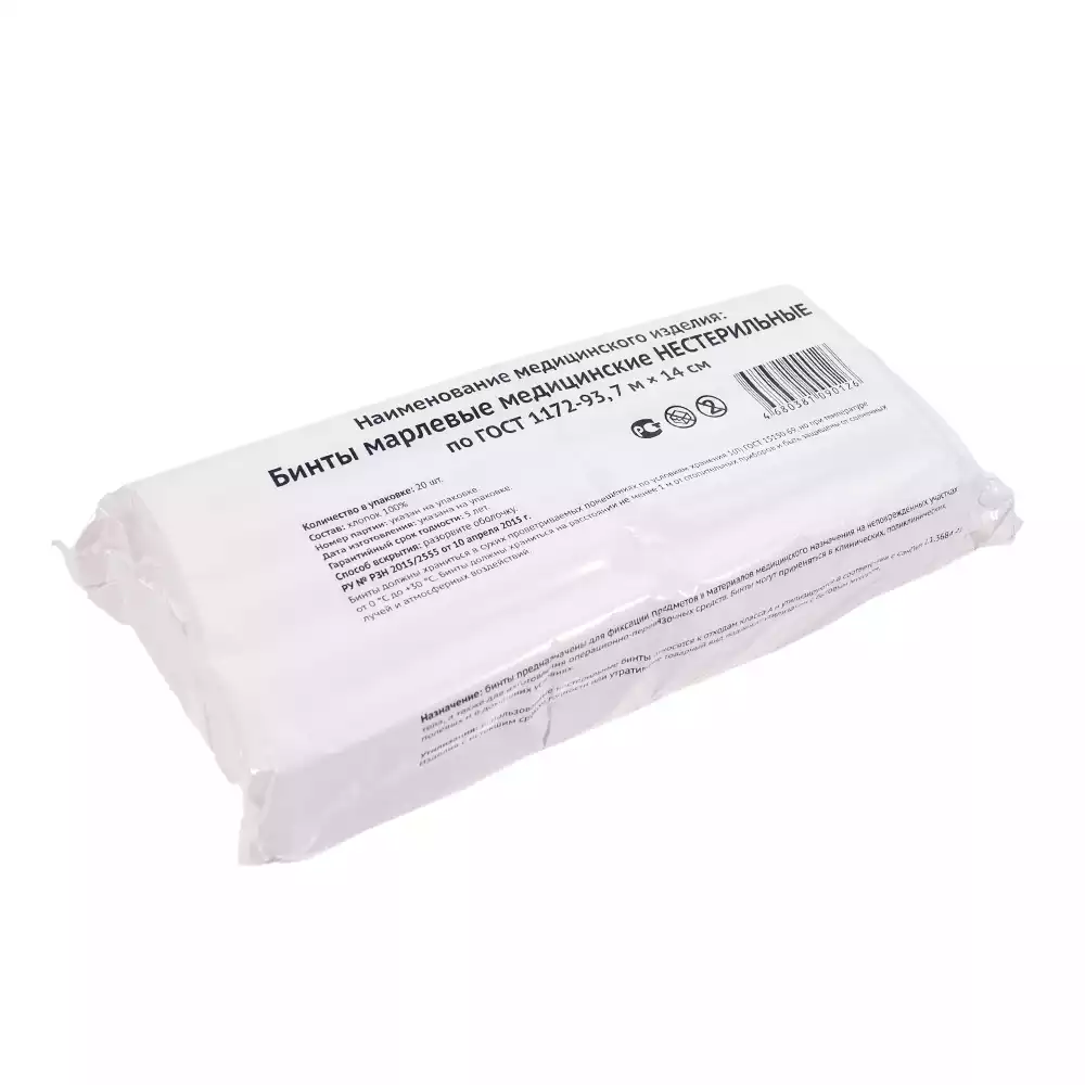 Бинт марлевый медицинский (плотность 36г/м2) предназначен для фиксации, наложения, изготовления операционно-перевязочных средств. Бинт производится из медицинской отбеленной марли, белого цвета, без швов и с обрезанной кромкой. Бинт имеет вид марлевого рулона, прессованного с четырех сторон и обрезанной, ровной кромкой с краев. Марлевые нестерильные бинты применяются в медицинских учреждениях для фиксации и наложения повязок, используются при отсутствии прямого контакта бинта с открытой раневой поверхностью. Нестерильные упакованы в общую упаковку (п/э пакет по 20 шт).
