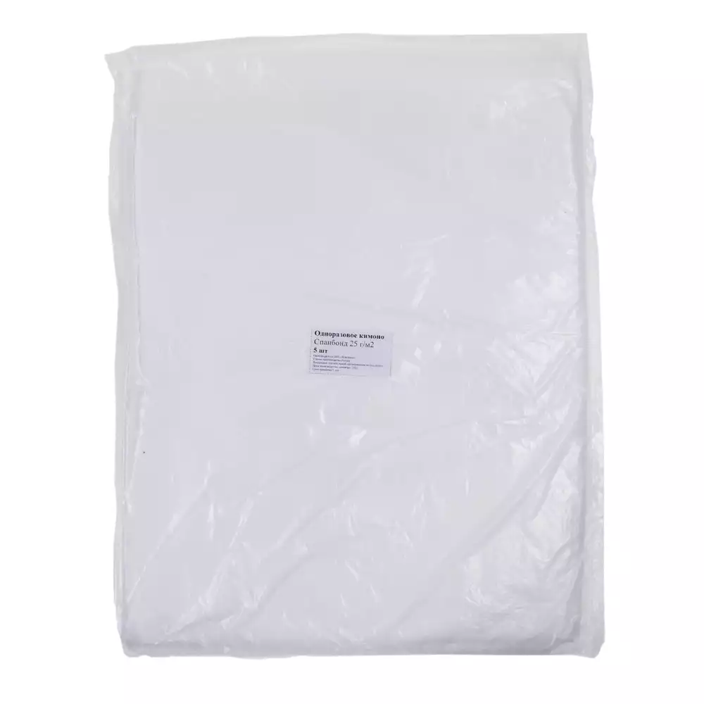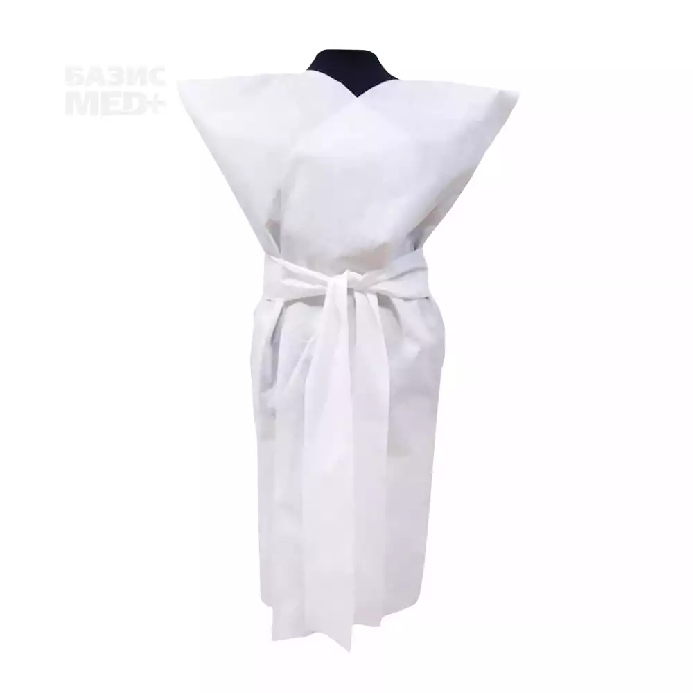 Одноразовый халат - кимоно для использования в медицинских центрах и косметологических салонах при проведении процедур. Материал спанбонд 25г/м2, цвет - белый, длина 110см, нестерильный.