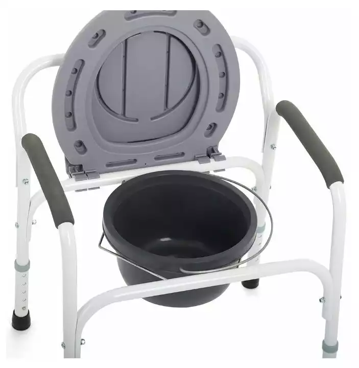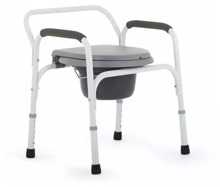 Съемное санитарное оснащение, откидываемая крышка, регулировка высоты сиденья, противоскользящие подлокотники, противоскользящие наконечники ножек