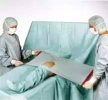Операционное поле обрабатывается традиционным способом с помощью дезинфицирующих растворов и ограничения операционным бельем, затем область операционного поля покрывают самоклеющейся прозрачной пленкой РАУКОДРЕЙП. Наклеиваясь на кожу и белье одновременно, РАУКОДРЕЙП фиксирует операционное белье (вместо цапок и липких лент).